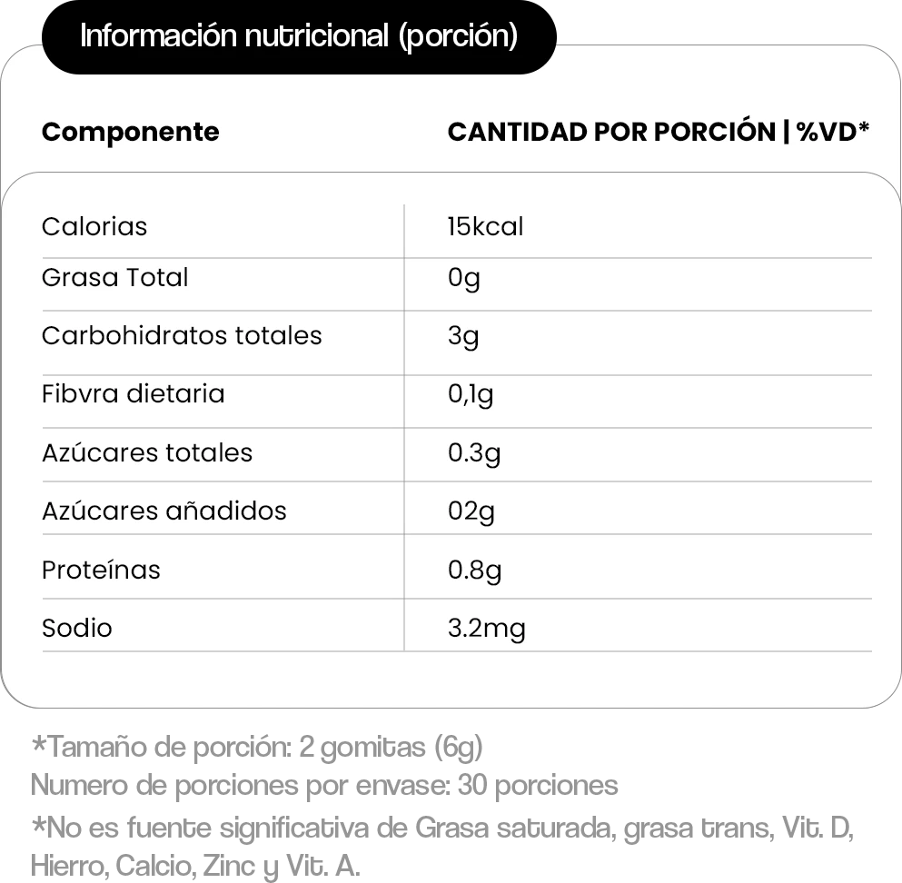 Toma 2 gomitas al día, preferiblemente antes de tus comidas principales.