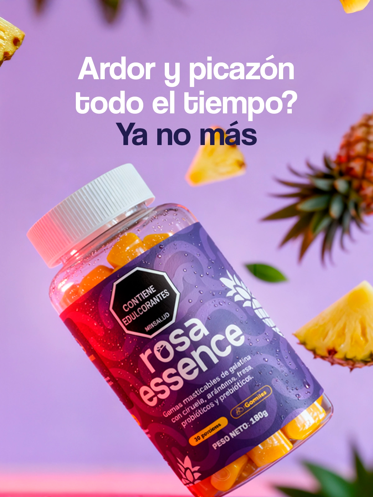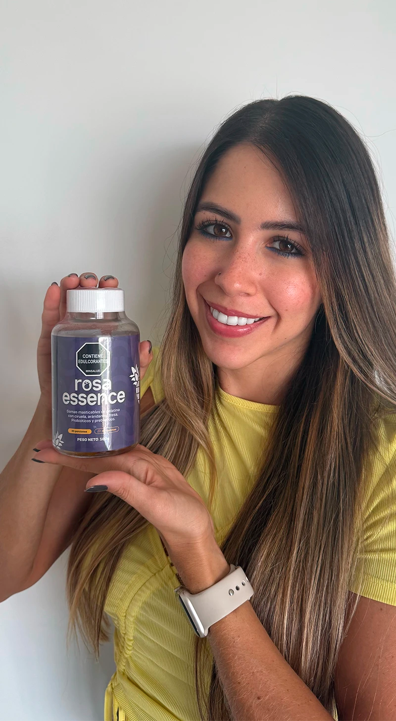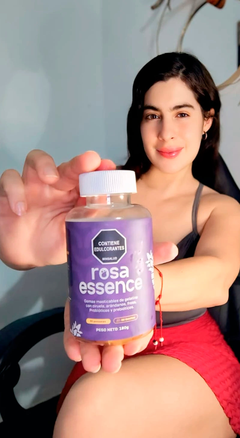 Rosa Essence es tu compañera para mantener el equilibrio natural de tu flora íntima y decirle adiós a esas molestias que interrumpen tu día. Con solo 2 gomitas al día, aportas probióticos, vitaminas y antioxidantes que refuerzan tus defensas, te brindan frescura y aumentan tu seguridad — sin complicaciones, sin tabúes.