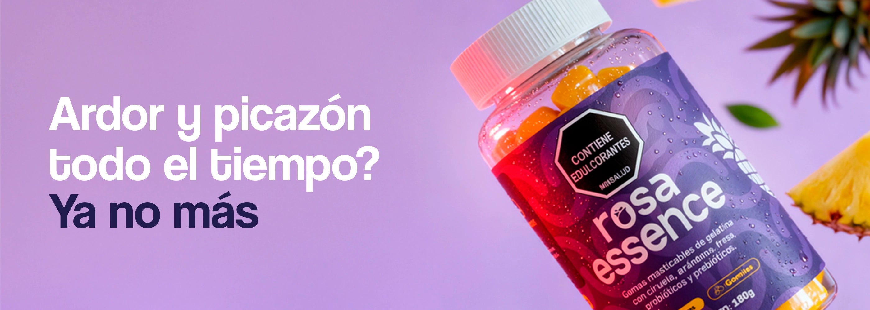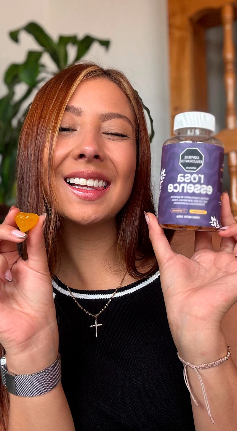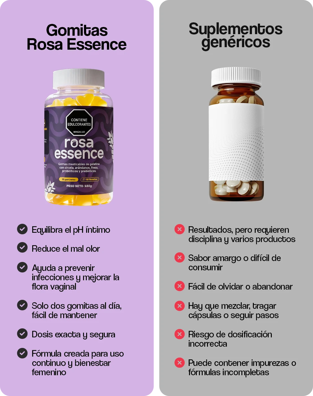 Rosa Essence es tu compañera para mantener el equilibrio natural de tu flora íntima y decirle adiós a esas molestias que interrumpen tu día. Con solo 2 gomitas al día, aportas probióticos, vitaminas y antioxidantes que refuerzan tus defensas, te brindan frescura y aumentan tu seguridad — sin complicaciones, sin tabúes.