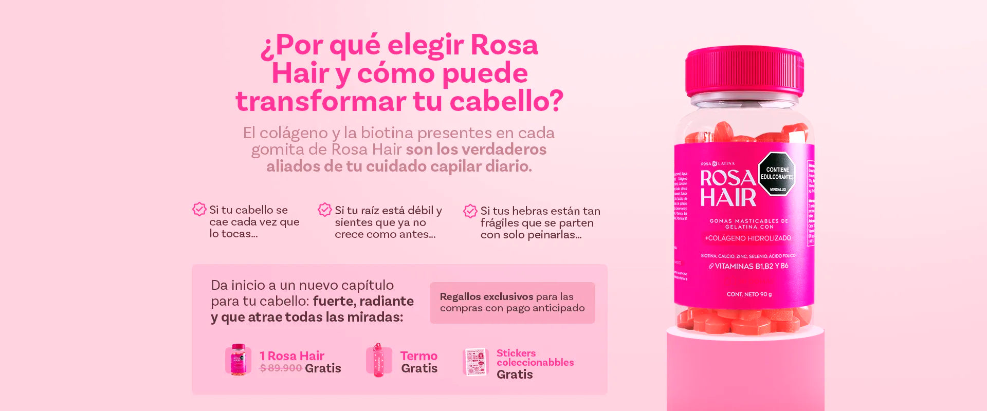 Rosa Hair está formulado con ingredientes poderosos, como colágeno hidrolizado, biotina y vitaminas para fortalecer tu cabello, uñas y piel.
