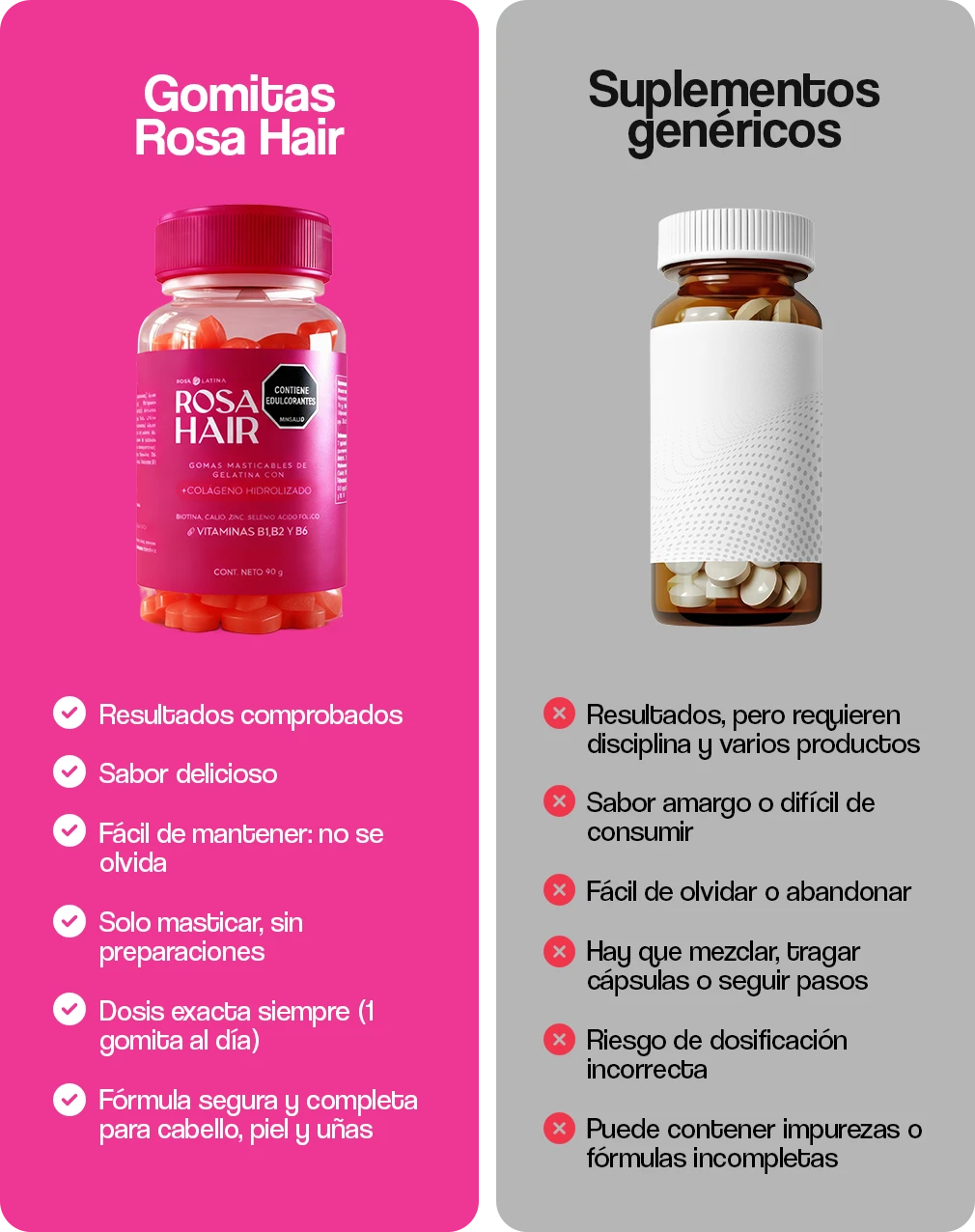 Rosa Hair aporta biotina, colágeno hidrolizado, vitaminas del complejo B y zinc, nutrientes que apoyan el crecimiento y la fortaleza del cabello desde adentro. En casos de posparto o desequilibrios hormonales, recomendamos hablar con tu médico para una evaluación integral. La fórmula apoya la queratinización y la fortaleza de la fibra, lo que puede ayudar a reducir quiebre y dar una apariencia de mayor densidad y brillo con el uso continuo y muchas usuarias reportan uñas menos frágiles y piel con mejor aspecto debido a vitaminas del complejo B y colágeno hidrolizado. Es un beneficio complementario al cuidado del cabello.