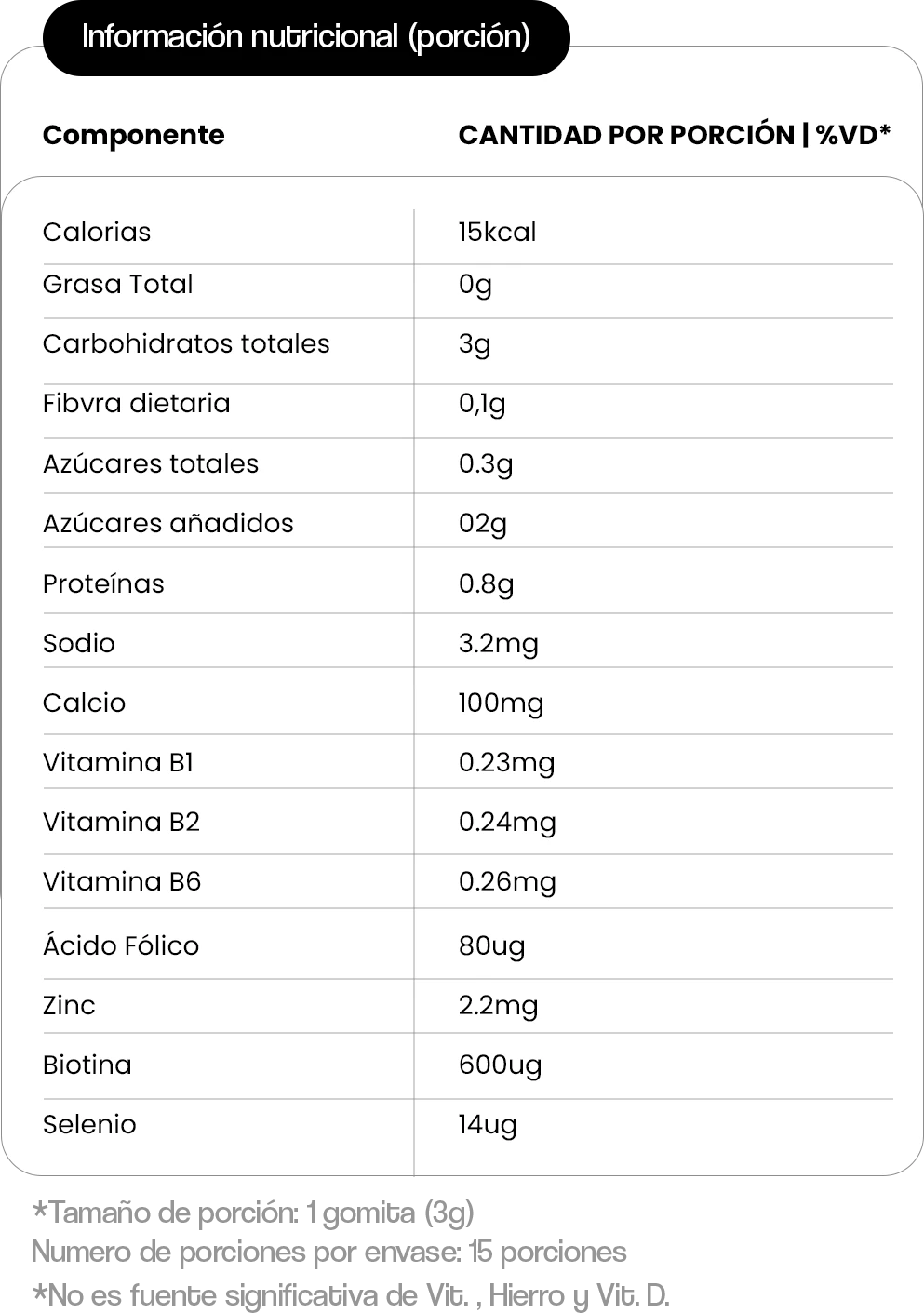Toma 1 gomita al día, preferiblemente pela manaña. Muchas usuarias prefieren después del desayuno para crear el hábito. La constancia diaria es más importante que el horario.